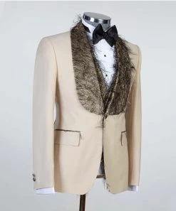 An expertly tailored tuxedo by JM Menswear, created in virgin wool with natural stretch for wearing comfort. Trimmed with silk accents at the lapels, pockets and pant side seams, this three-piece tuxedo is cut to a defined fit for a modern silhouette. Silk-covered buttons add the finishing touch to this timeless ensemble.