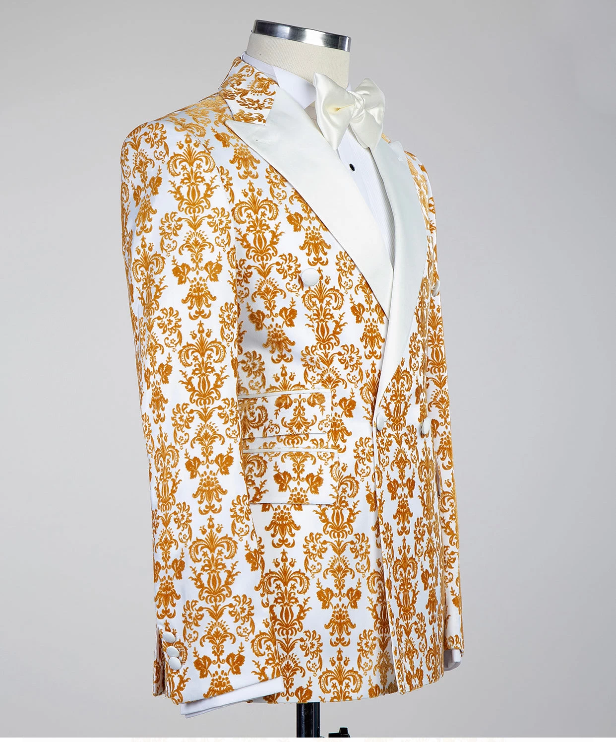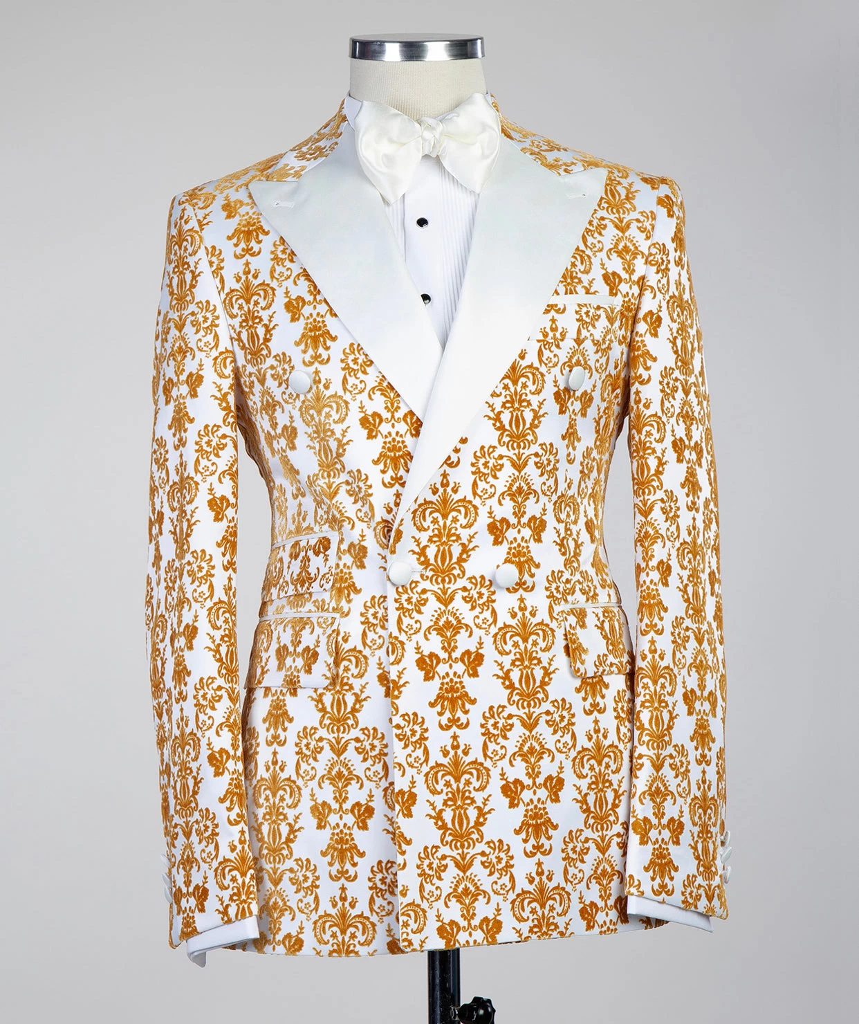 An expertly tailored tuxedo by JM Menswear, Created in virgin wool with natural stretch for wearing comfort. Trimmed with silk accents at the lapels, pockets and pant side seams, this three-piece tuxedo is cut to a defined fit for a modern silhouette.silk-covered buttons add the finishing touch to this timeless ensemble.