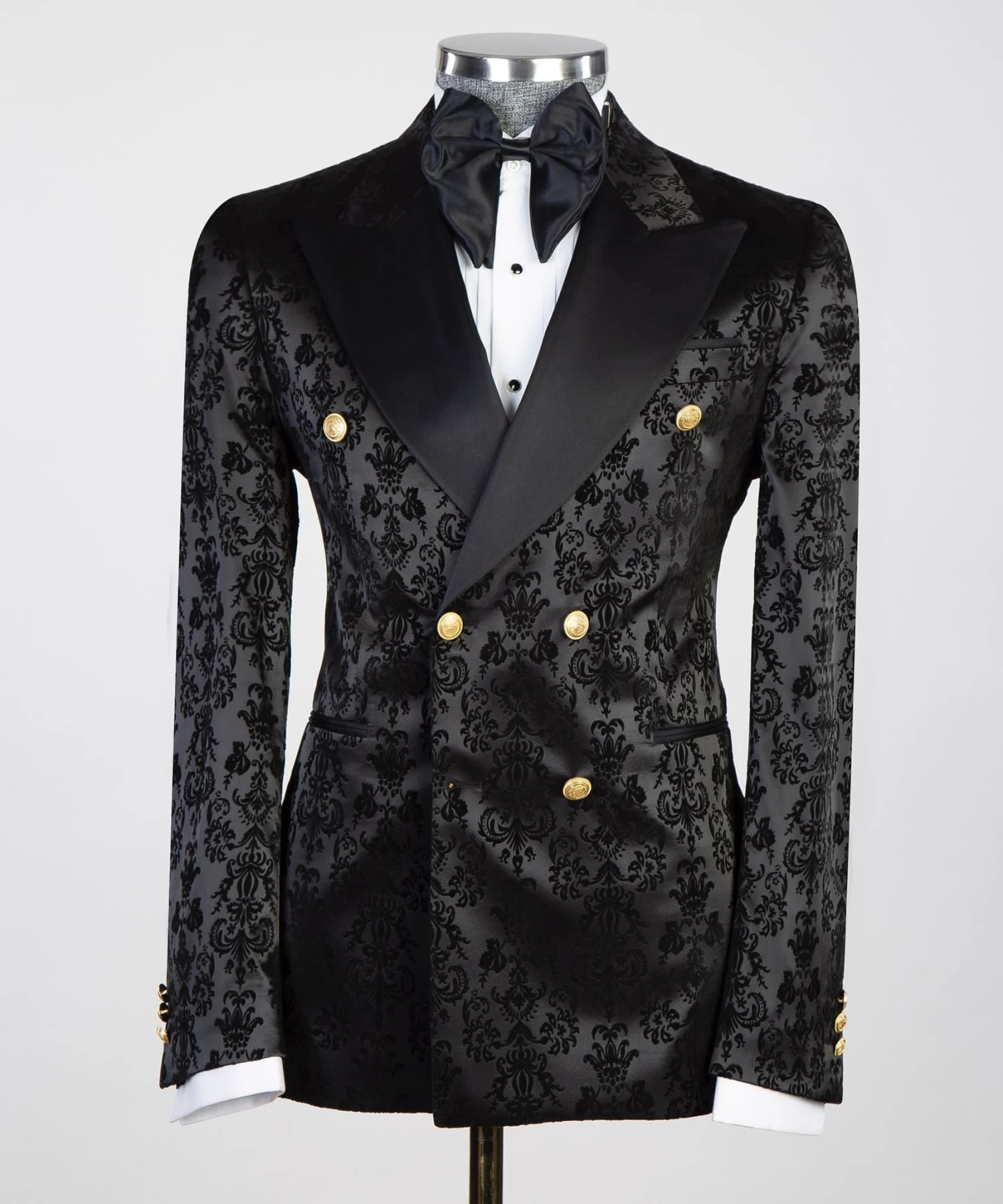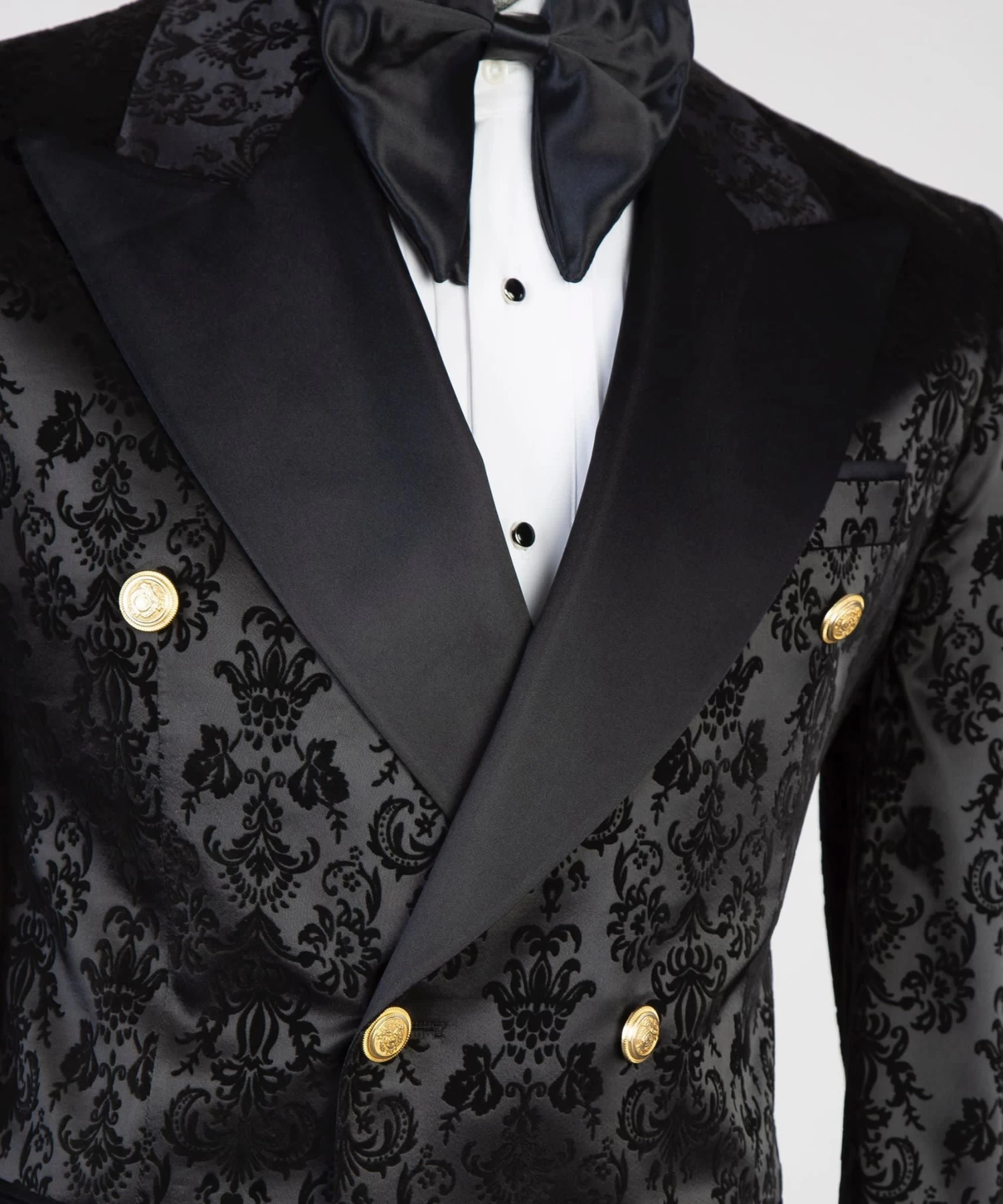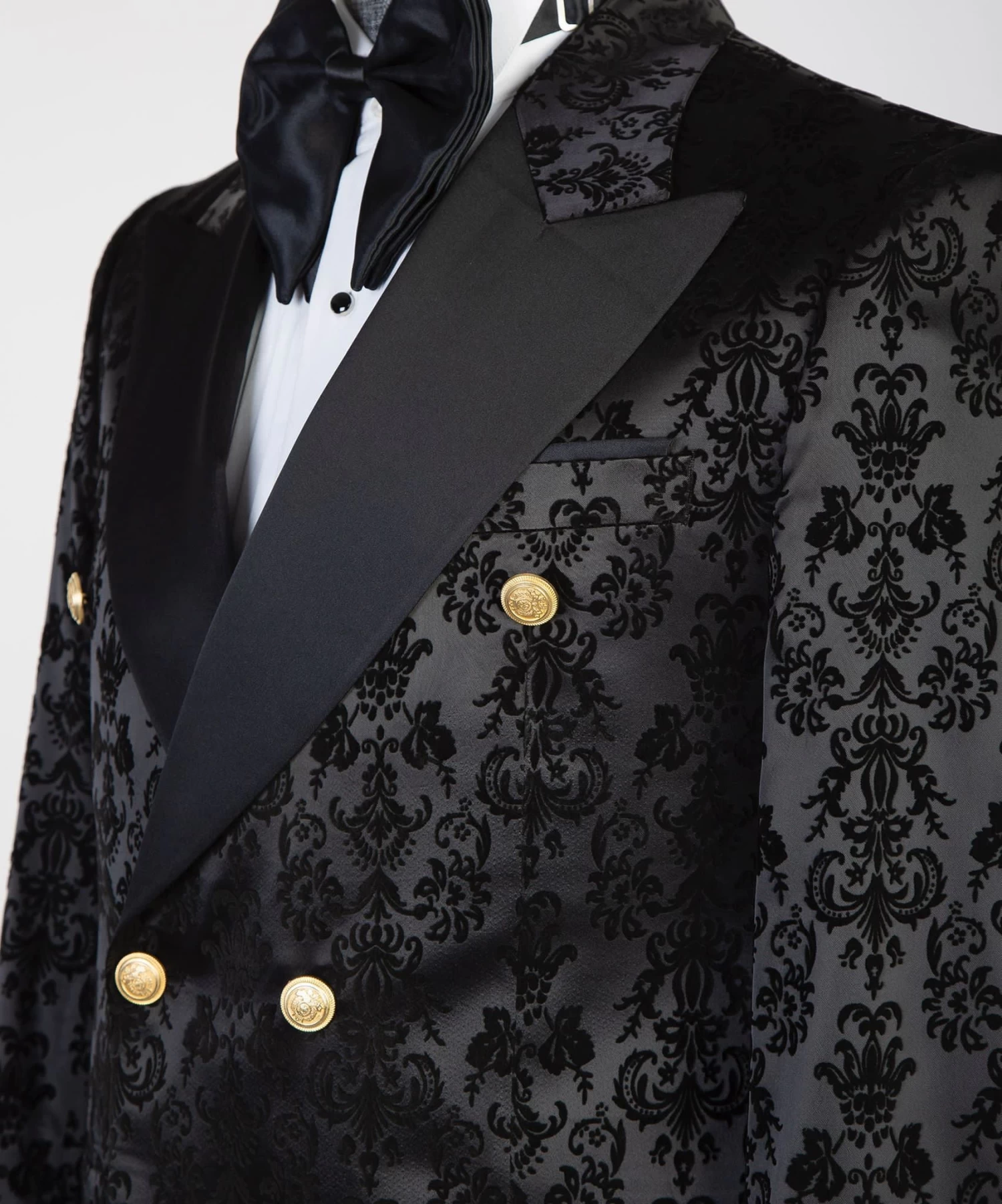 An expertly tailored tuxedo by JM Menswear, Created in virgin wool with natural stretch for wearing comfort. Trimmed with silk accents at the lapels, pockets and pant side seams, this three-piece tuxedo is cut to a defined fit for a modern silhouette.silk-covered buttons add the finishing touch to this timeless ensemble.