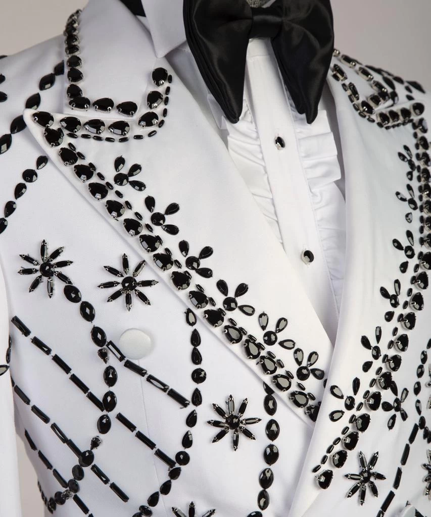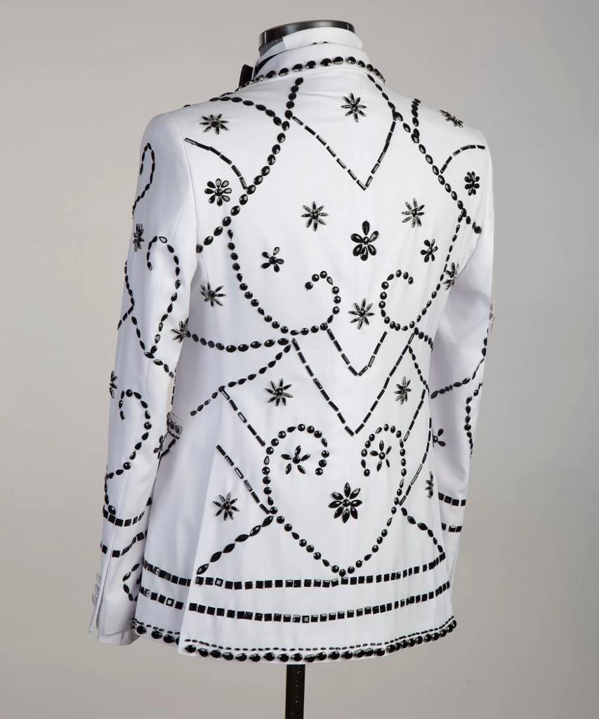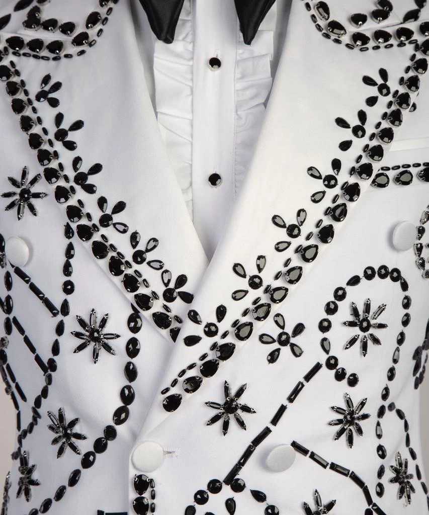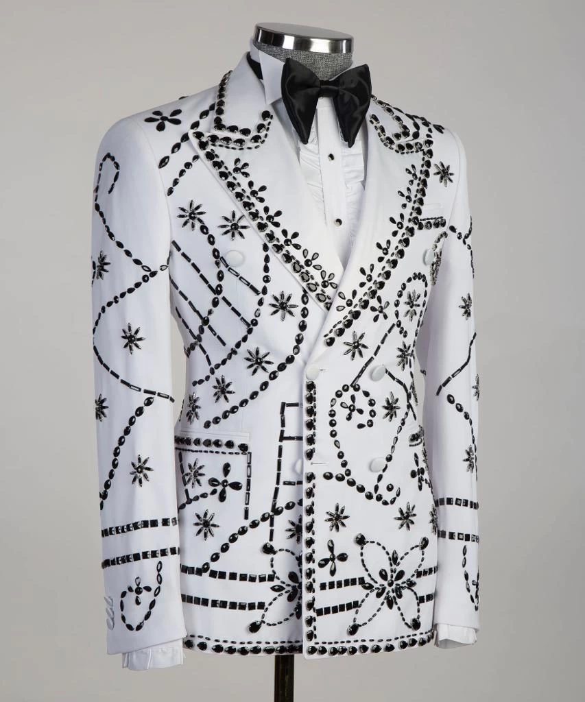 White Royal Double Breasted tuxedo  Suit by JM Menswear, Created in virgin wool with natural stretch for wearing comfort. Trimmed with silk accents at the lapels, pockets and pant side seams, this three-piece tuxedo is cut to a defined fit for a modern silhouette.silk-covered buttons add the finishing touch to this timeless ensemble.