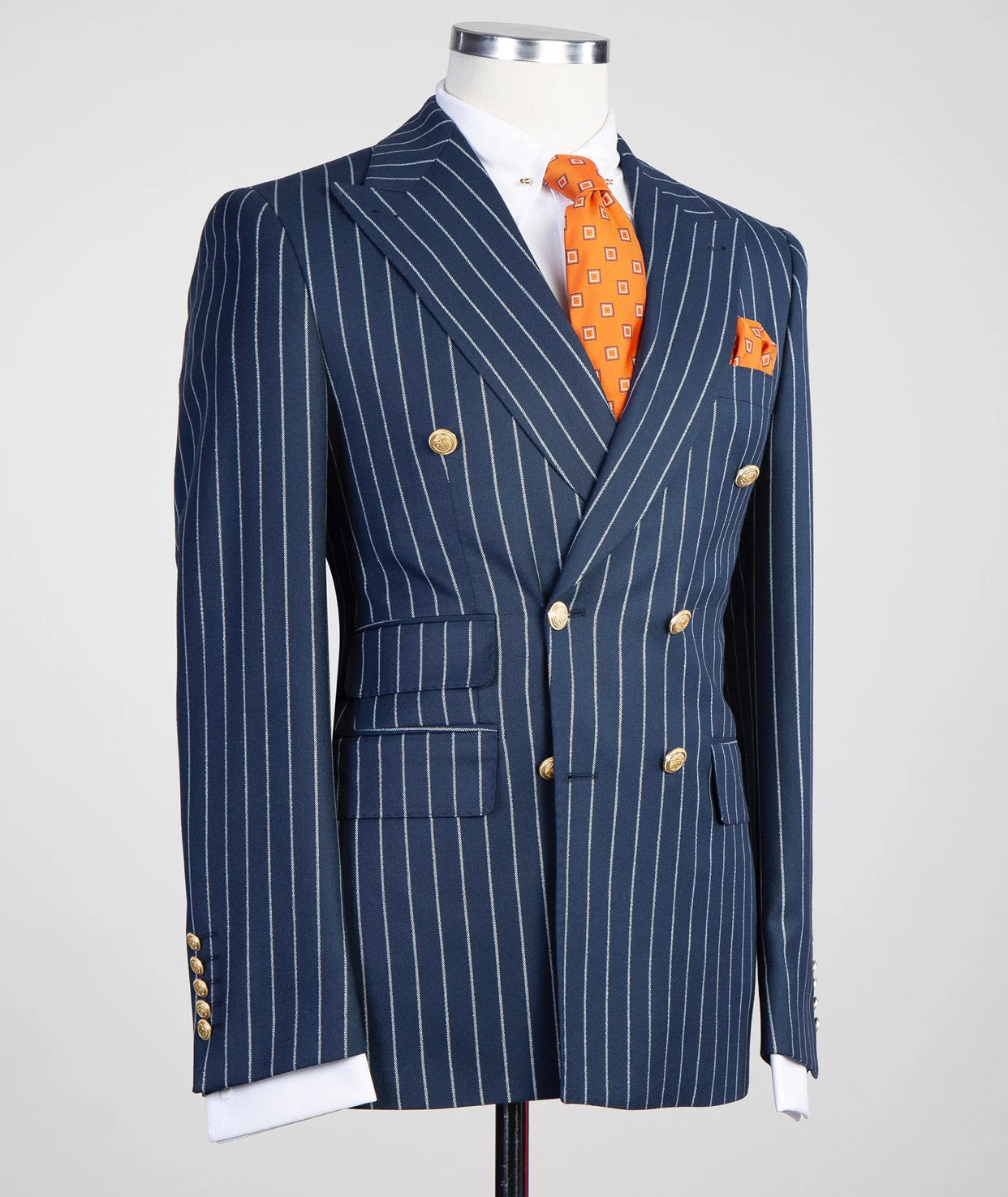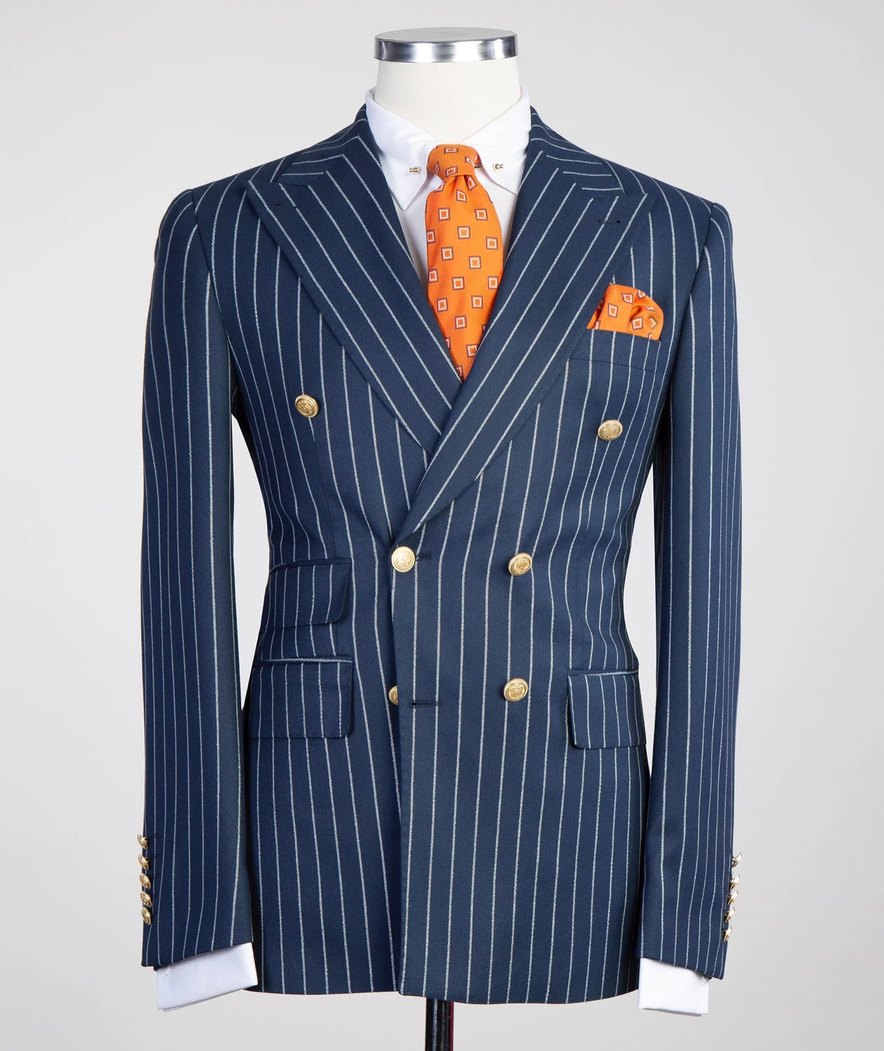 Navy blue double breas suit by JM Menswear.Created in silk-wool for a luxurious feel, this modern. suit is cut to a relaxed fit and comprises trousers and a single-breasted jacket with silk accents throughout.Complete the look with JM Menswear accessories for effortless refinement.