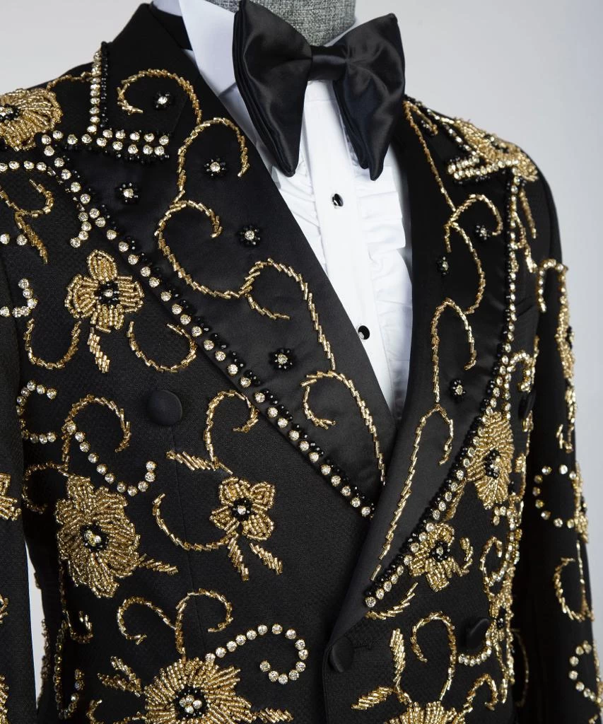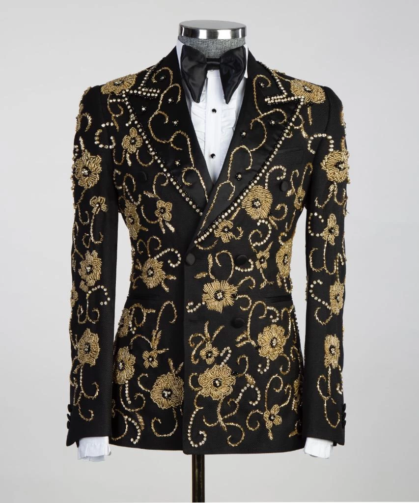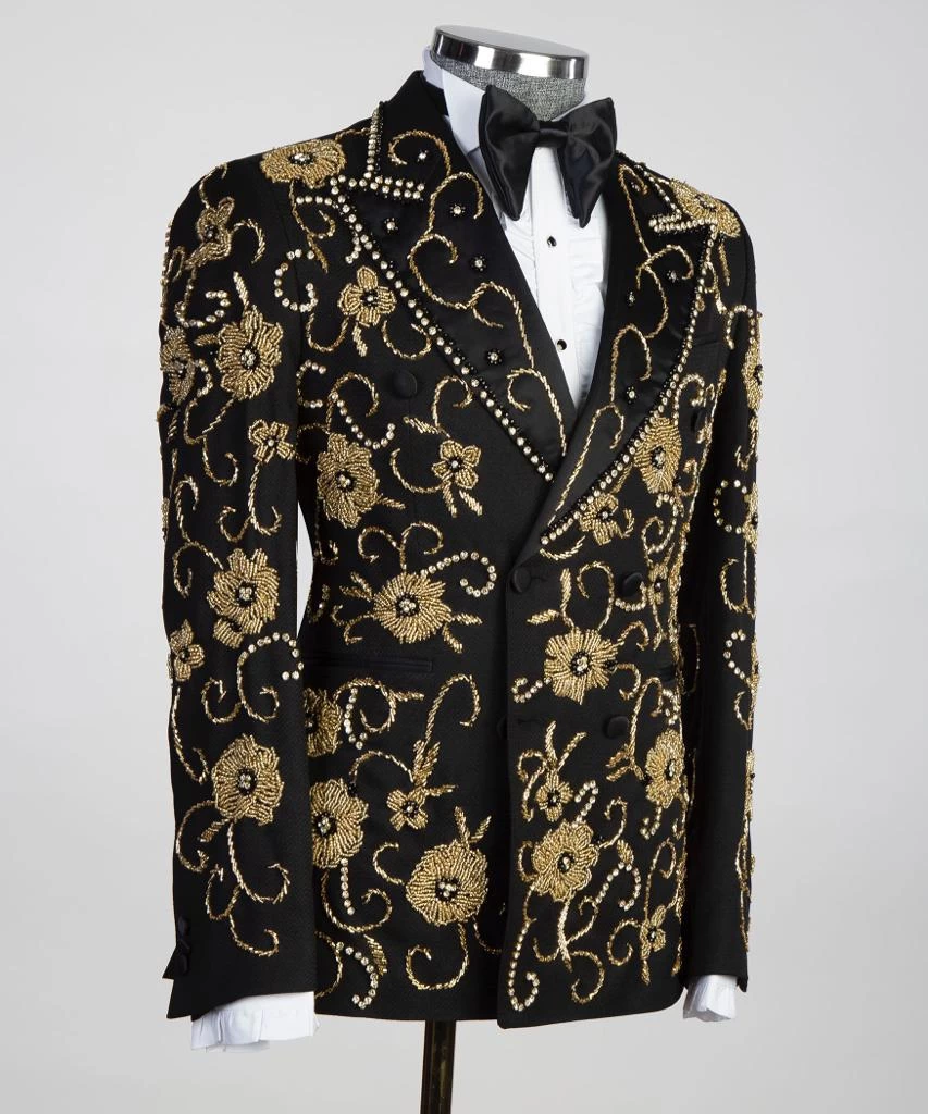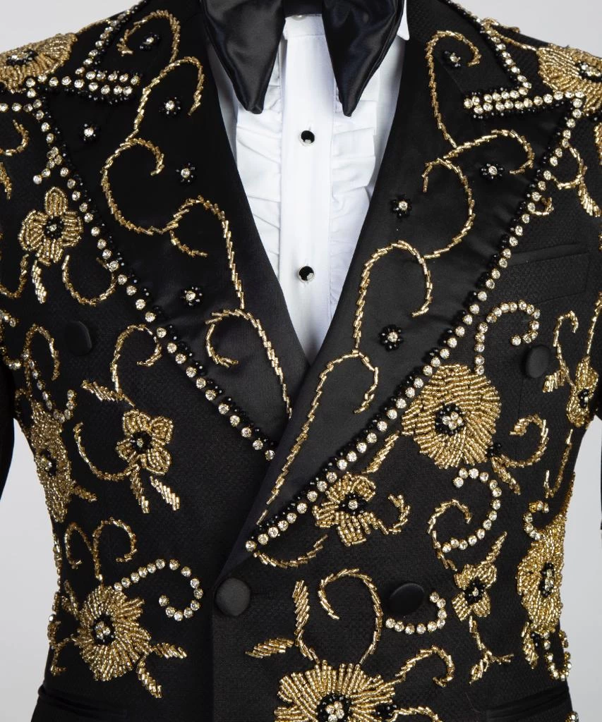 Royal Double Breasted tuxedo  Suit by JM Menswear, Created in virgin wool with natural stretch for wearing comfort. Trimmed with silk accents at the lapels, pockets and pant side seams, this three-piece tuxedo is cut to a defined fit for a modern silhouette.silk-covered buttons add the finishing touch to this timeless ensemble.