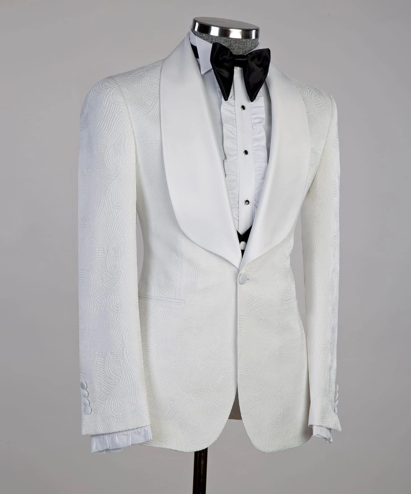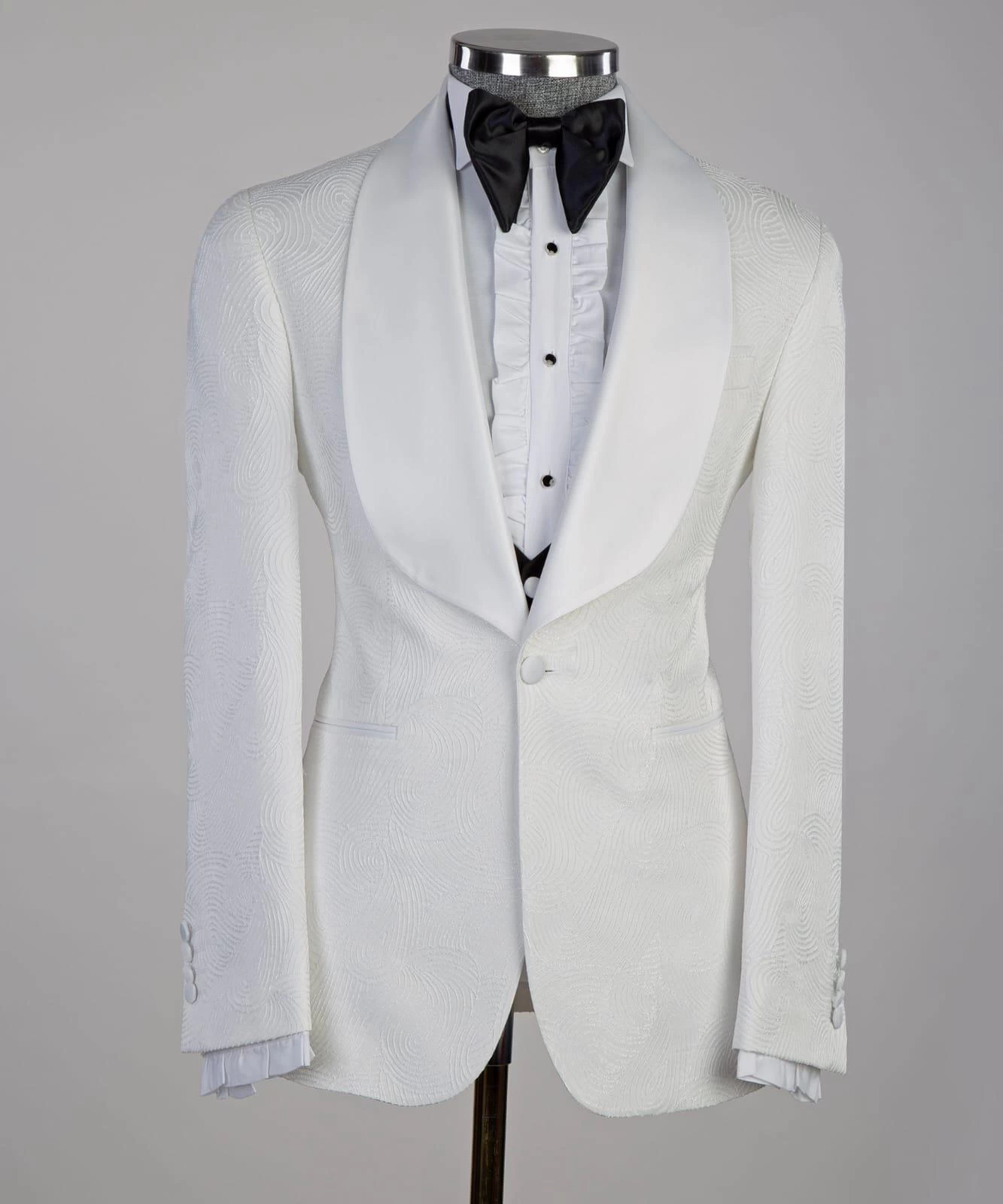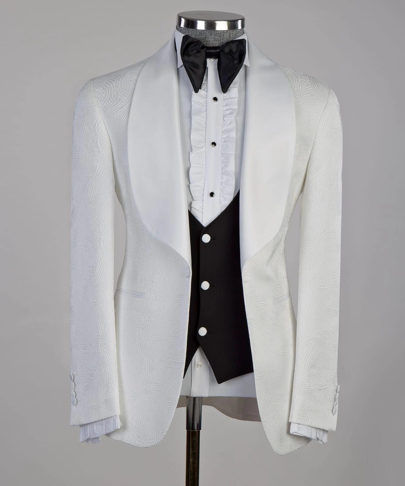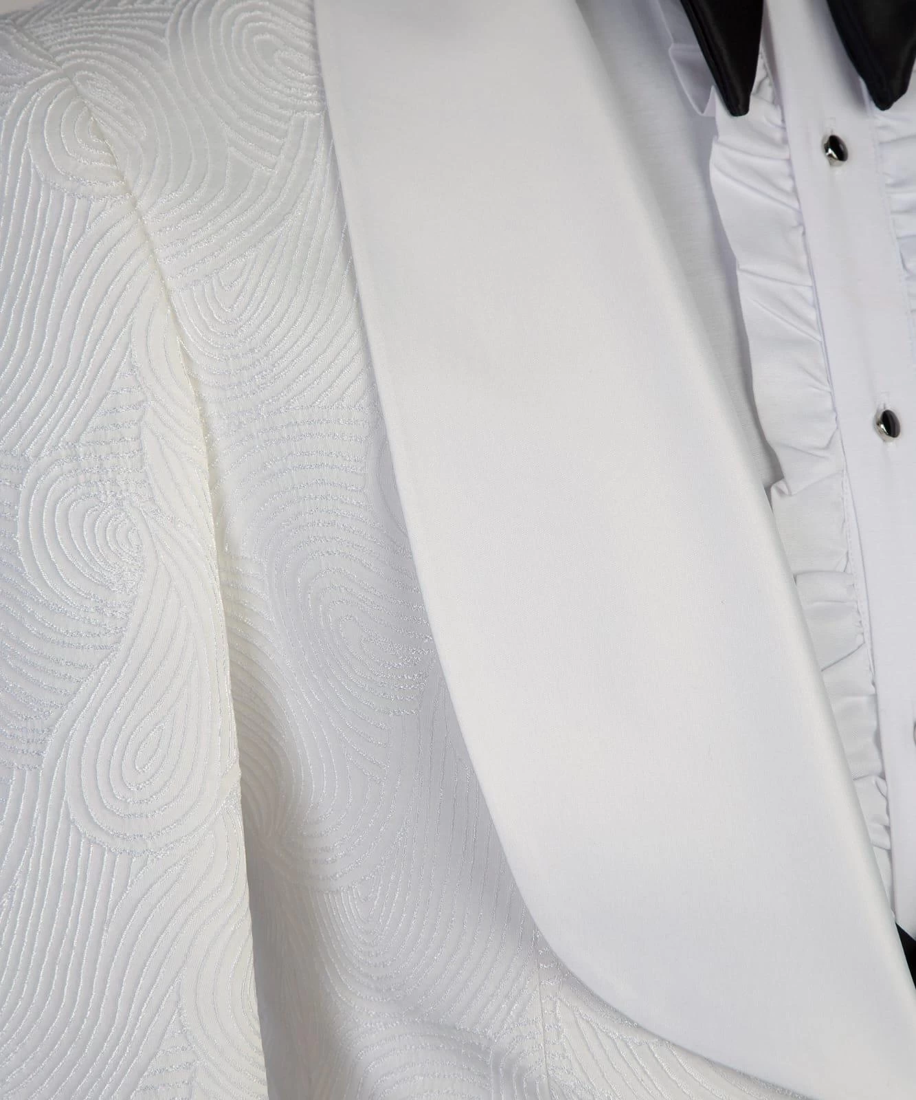 An expertly tailored Shining suit by JM Menswear, Created in virgin wool with natural stretch for wearing comfort. Trimmed with silk accents at the lapels, pockets and pant side seams, this three-piece shining suit is cut to a defined fit for a modern silhouette.silk-covered buttons add the finishing touch to this timeless ensemble.