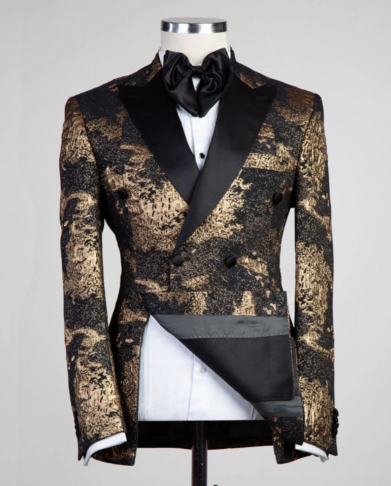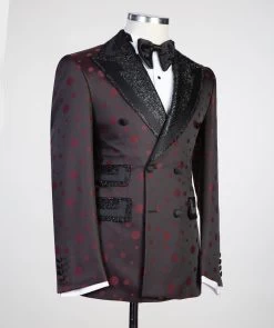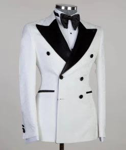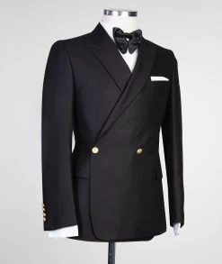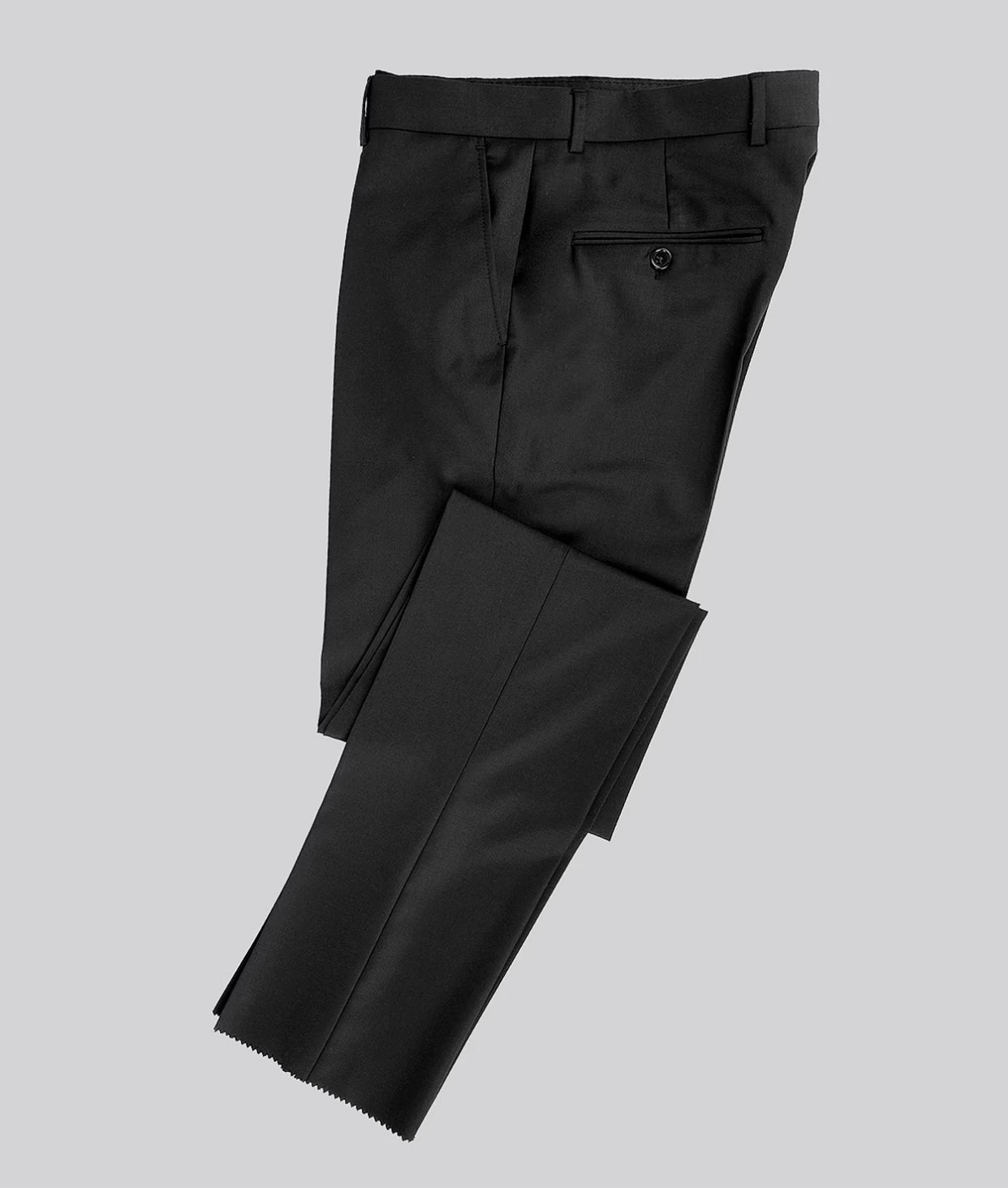 An expertly tailored tuxedo by JM Menswear, Created in virgin wool with natural stretch for wearing comfort. Trimmed with silk accents at the lapels, pockets and pant side seams, this three-piece tuxedo is cut to a defined fit for a modern silhouette.silk-covered buttons add the finishing touch to this timeless ensemble.