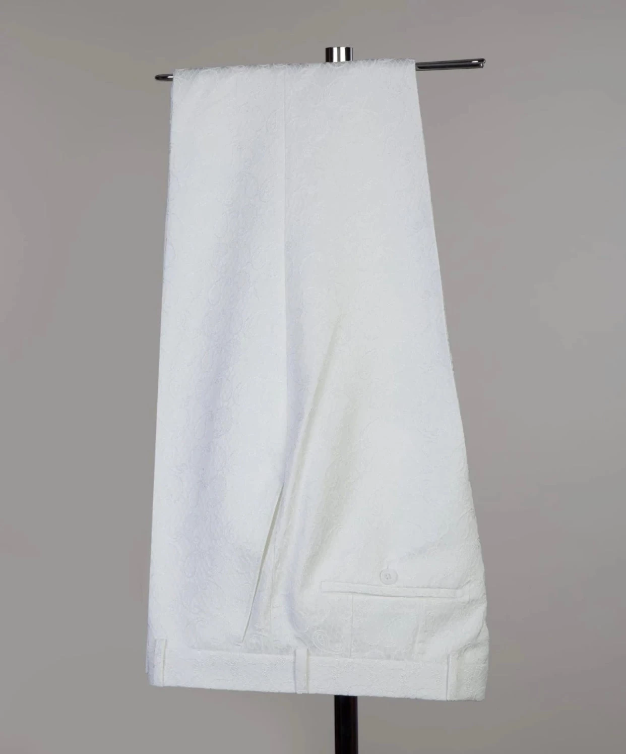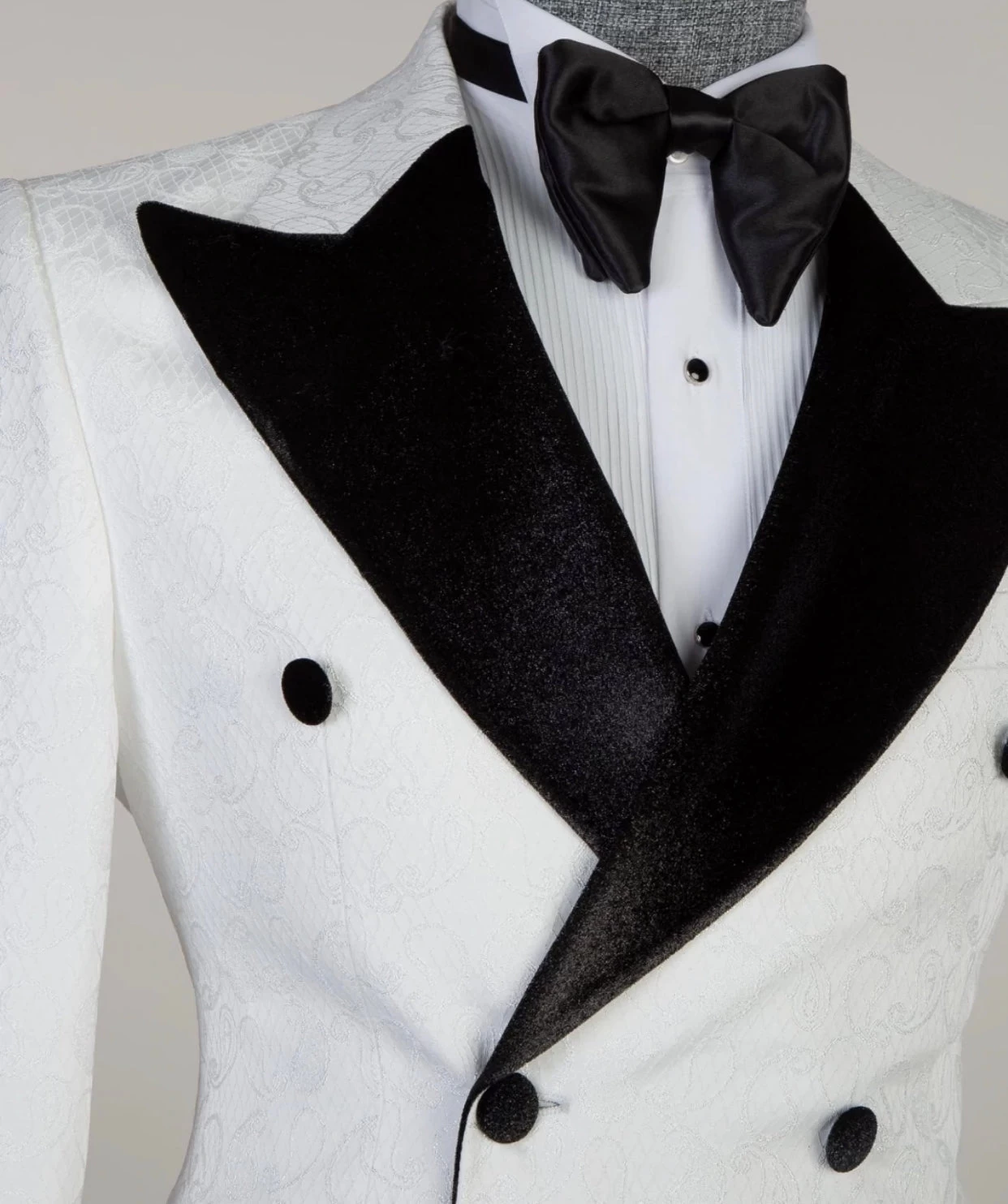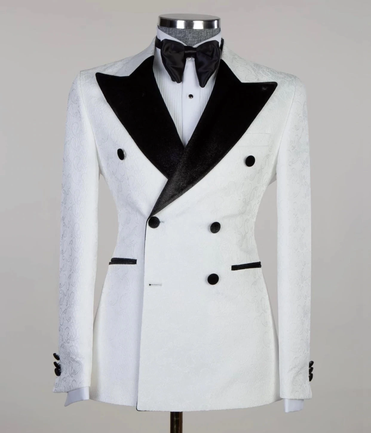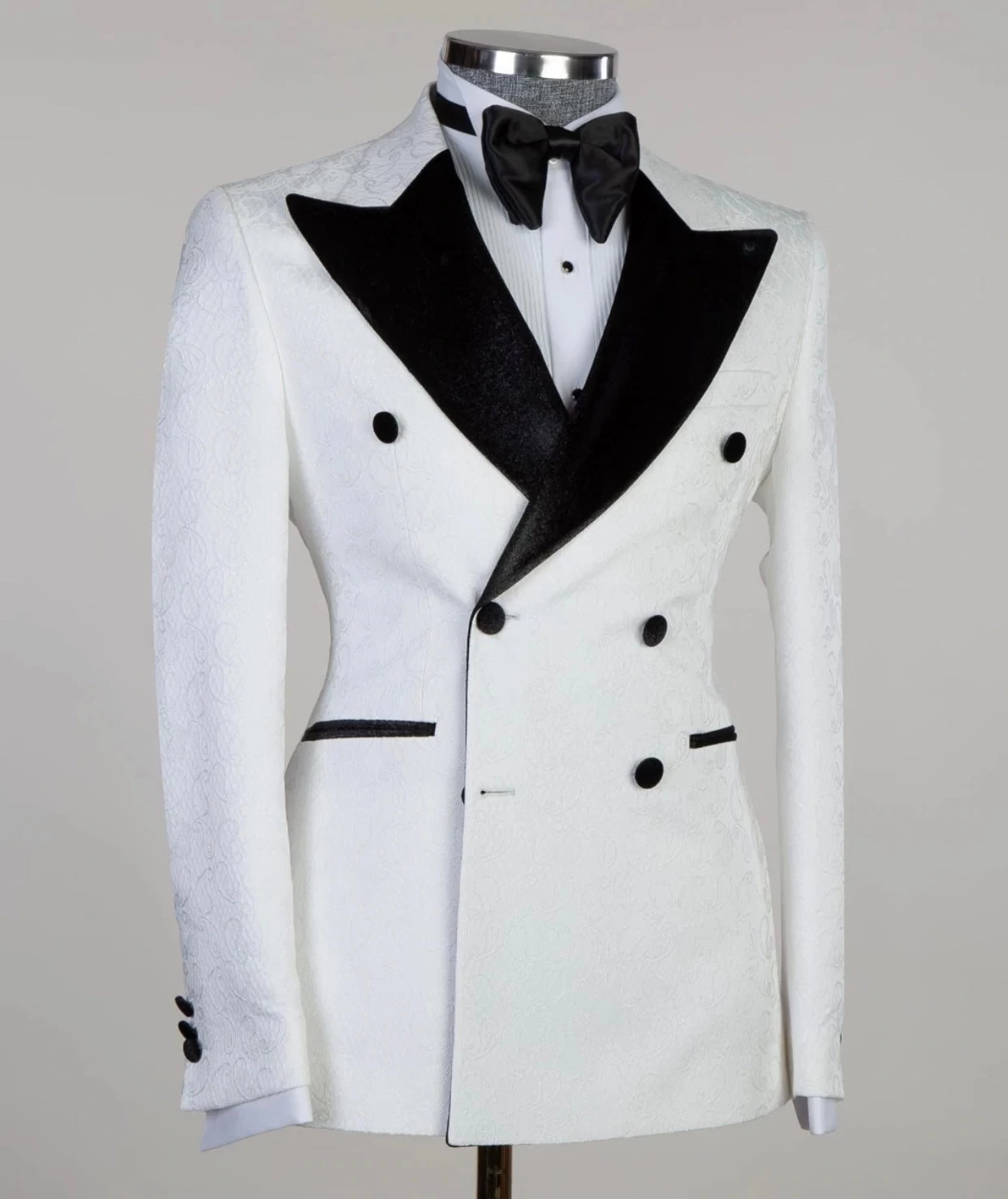 White double breasted Suit by JM Menswear, Woven in Virgin wool with a refined micro pattern. Comprising a single-breasted jacket and straight-leg trousers, and vest. this modern suit is offered in a regular fit with a sharp silhouette that doesn’t feel restrictive.
